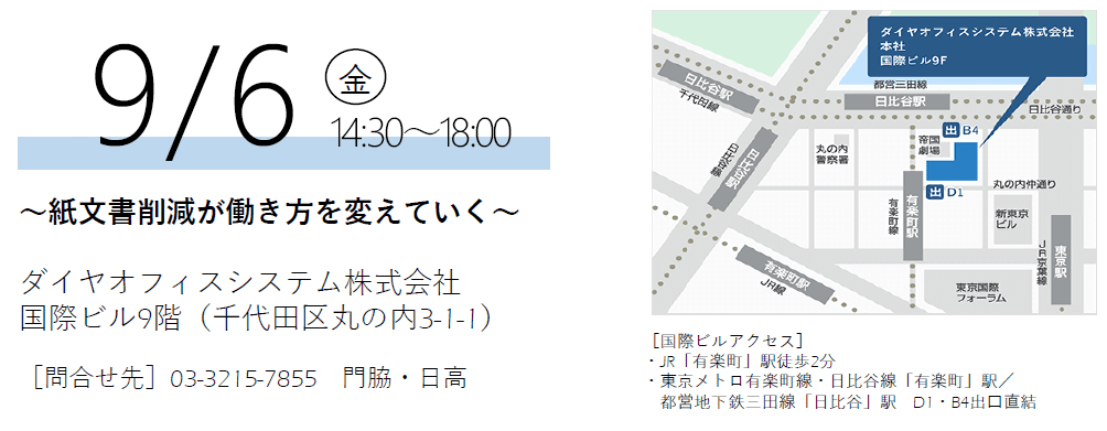 横山のセミナーは、セミナーⅡ(15時40分~16時50分)の「beyond paperless〜紙、本当に減らせてますか?」となります。他セミナープログラムの詳細は、ダイヤオフィスシステムのホームページにてご確認ください。本セミナーは前回開催へ参加できなかった方からのご要望で再度実施させていただくものです。