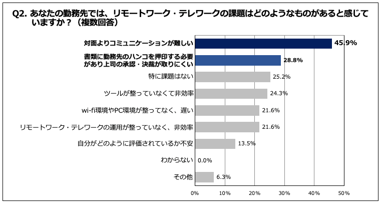 続けて、「Q2. あなたの勤務先では、リモートワーク・テレワークの課題はどのようなものがあると感じていますか?」(n=111)と質問したところ、「対面よりコミュニケーションが難しい」が45.9%で最多、次いで「書類に勤務先のハンコを押印する必要があり上司の承認・決裁が取りにくい」が28.8%の順になりました。