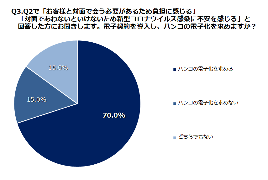 Q2で「お客様と対面で会う必要があるため負担に感じる」「対面であわないといけないため新型コロナウイルス感染に不安を感じる」と回答した方に、「Q3.電子契約を導入し、ハンコの電子化を求めますか?」(n=40)と質問したところ、「ハンコの電子化を求める」が70.0%と、7割の銀行員がハンコの電子化を求めていることが判明しました。