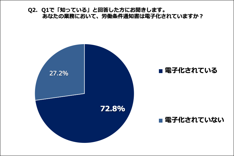 Q1で「知っている」と回答した方に、「Q2. あなたの業務において、労働条件通知書は電子化されていますか?」(n=92)と質問したところ、「電子化されている」が72.8%、「電子化されていない」が27.2%という回答になりました。