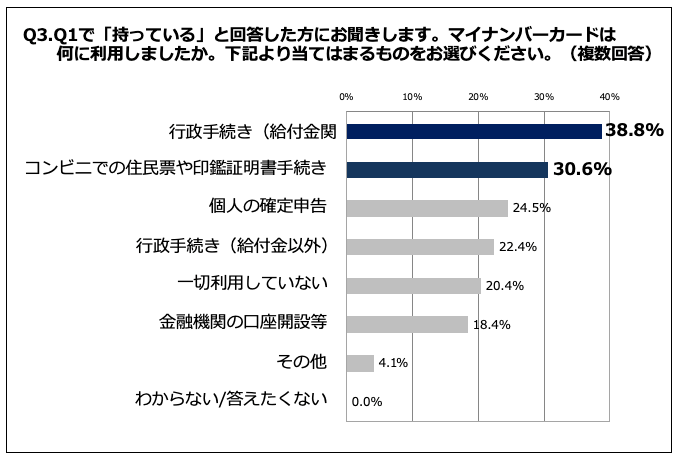 Q1で「持っている」と回答した方に、「Q3. マイナンバーカードは何に利用しましたか。下記より当てはまるものをお選びください。(複数回答)」(n=49)と質問したところ、「行政手続き(給付金関連)」が38.8%、「コンビニでの住民票や印鑑証明書手続き」が30.6%という回答となりました。