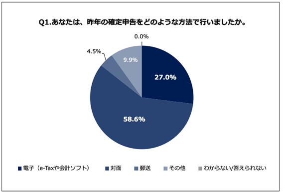 「Q1.あなたは、昨年の確定申告をどのような方法で行いましたか。」(n=111)と質問したところ、「電子(e-Taxや会計ソフト)」が27.0%、「対面」が58.6%という回答となりました。