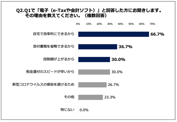 Q1で「電子(e-Taxや会計ソフト)」と回答した方に、「Q2.その理由を教えてください。(複数回答)」(n=30)と質問したところ、「自宅で効率的にできるから」が66.7%、「添付書類を省略できるから」が36.7%、「控除額が上がるから」が30.0%という回答となりました。