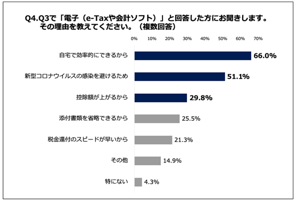 Q3で「電子(e-Taxや会計ソフト)」と回答した方に、「Q4.その理由を教えてください。(複数回答)」(n=47)と質問したところ、「自宅で効率的にできるから」が66.0%、「新型コロナウイルスの感染を避けるため」が51.1%、「控除額が上がるから」が29.8%という回答となりました。