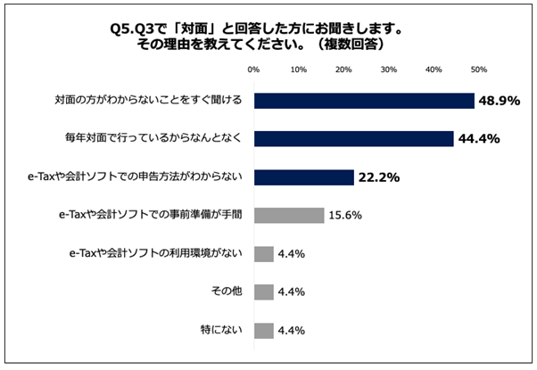 Q3で「対面」と回答した方に、「Q5.その理由を教えてください。(複数回答)」(n=45)と質問したところ、「対面の方がわからないことをすぐ聞ける」が48.9%、「毎年対面で行っているからなんとなく」が44.4%、「e-Taxや会計ソフトでの申告方法がわからない」が22.2%という回答となりました。