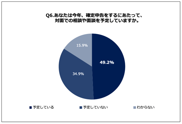 Q3で「電子(e-TAXや会計ソフト)」「郵送」「その他」のいずれかを選択した方に、「Q6.あなたは今年、確定申告をするにあたって、対面での相談や面談を予定していますか。」(n=63)と質問したところ、「予定している」が49.2%という回答となりました。