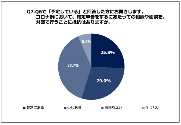 Q6で「予定している」と回答した方に、「Q7.コロナ禍において、確定申告をするにあたっての相談や面談を、対面で行うことに抵抗はありますか。」(n=31)と質問したところ、「非常にある」が25.8%、「少しある」が29.0%という回答となりました。
