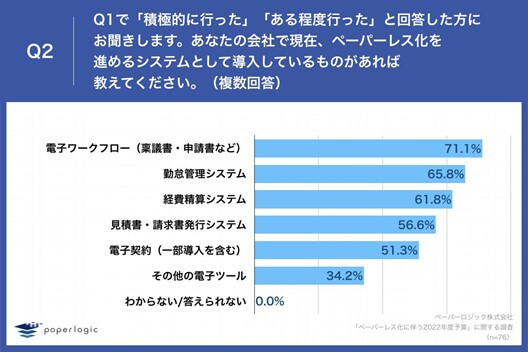 「Q2.Q1で「積極的に行った」「ある程度行った」と回答した方にお聞きします。あなたの会社で現在、ペーパーレス化を進めるシステムとして導入しているものがあれば教えてください。(複数回答)」(n=76)と質問したところ、「電子ワークフロー(稟議書・申請書など)」が71.1%、「勤怠管理システム」が65.8%、「経費精算システム」が61.8%という回答となりました。
