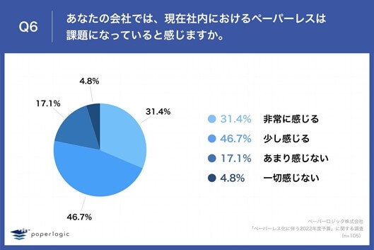 「Q6.あなたの会社では、現在社内におけるペーパーレスは課題になっていると感じますか。」(n=105)と質問したところ、「非常に感じる」が31.4%、「少し感じる」が46.7%という回答となりました。