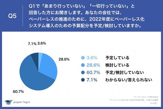 「Q5.Q1で「あまり行っていない」「一切行っていない」と回答した方にお聞きします。あなたの会社では、ペーパーレスの推進のために、2022年度にペーパーレス化システム導入のための予算配分を予定/検討していますか。」(n=28)と質問したところ、「予定している」が3.6%、「検討している」が28.6%という回答となりました。
