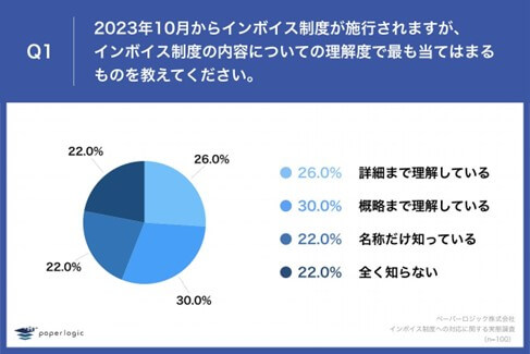 「Q1.2023年10月からインボイス制度が施行されますが、インボイス制度の内容についての理解度で最も当てはまるものを教えてください。」(n=100)と質問したところ、「詳細まで理解している」が26.0%、「概略まで理解している」が30.0%という回答となりました。