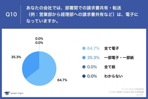Q7で「行われている」かつQ6で「すでに導入済」と回答した方に、「Q10.あなたの会社では、部署間での請求書共有・転送(例:営業部から経理部への請求書共有など)は、電子になっていますか。」(n=17)と質問したところ、「全て電子」が64.7%、「一部電子・一部紙」が35.3%という回答となりました。