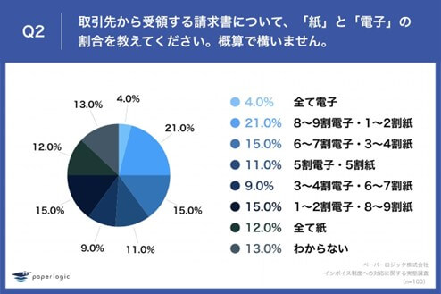 「Q2.取引先から受領する請求書について、「紙」と「電子」の割合を教えてください。概算で構いません。」(n=100)と質問したところ、「8~9割電子・1~2割紙」が21.0%、「6~7割電子・3~4割紙」が15.0%という回答となりました。
