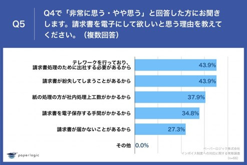 Q4で「非常に思う・やや思う」と回答した方に、「Q5.請求書を電子にして欲しいと思う理由を教えてください。(複数回答)」(n=66)と質問したところ、「テレワークを行っており、請求書処理のために出社する必要があるから」が43.9%、「請求書が紛失してしまうことがあるから」が43.9%、「紙の処理の方が社内処理上工数がかかるから」が37.9%という回答となりました。