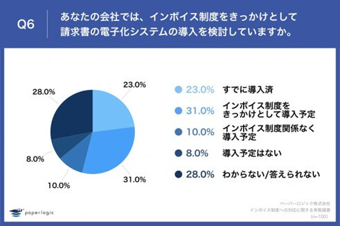 「Q6.あなたの会社では、インボイス制度をきっかけとして請求書の電子化システムの導入を検討していますか。」(n=100)と質問したところ、「すでに導入済」が23.0%、「インボイス制度をきっかけとして導入予定」が31.0%という回答となりました。