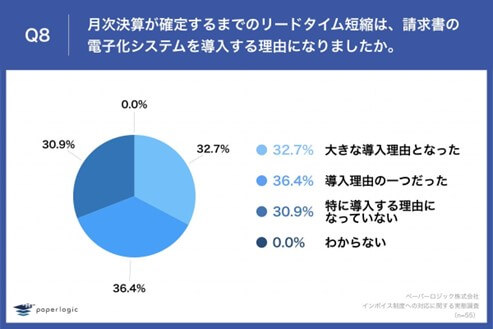 Q7で「行われている」かつQ6で「すでに導入済」「インボイス制度をきっかけとして導入予定」「インボイス制度関係なく導入予定」と回答した方に、「Q8.月次決算が確定するまでのリードタイム短縮は、請求書の電子化システムを導入する理由になりましたか。」(n=55)と質問したところ、「大きな導入理由となった」が32.7%、「導入理由の一つだった」が36.4%という回答となりました。