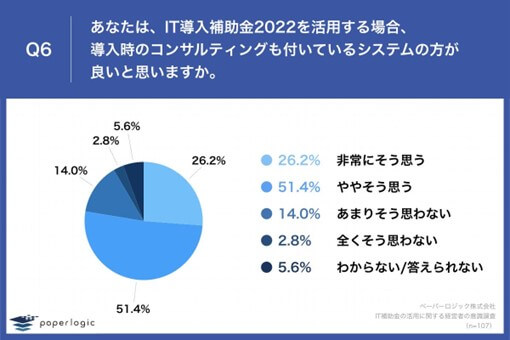 「Q6.あなたは、IT導入補助金2022を活用する場合、導入時のコンサルティングも付いているシステムの方が良いと思いますか。」(n=107)と質問したところ、「非常にそう思う」が26.2%、「ややそう思う」が51.4%という回答となりました。