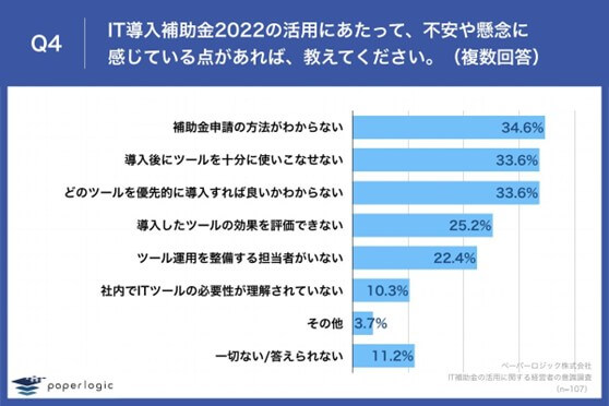 「Q4.IT導入補助金2022の活用にあたって、不安や懸念に感じている点があれば、教えてください。(複数回答)」(n=107)と質問したところ、「補助金申請の方法がわからない」が34.6%、「導入後にツールを十分に使いこなせない」が33.6%、「どのツールを優先的に導入すれば良いかわからない」が33.6%という回答となりました。
