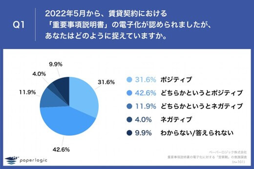 「Q1.2022年5月から、賃貸契約における「重要事項説明書」の電子化が認められましたが、あなたはどのように捉えていますか。」(n=101)と質問したところ、「ポジティブ」が31.6%、「どちらかというとポジティブ」が42.6%という回答となりました。
