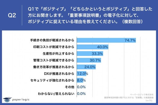 Q1で「ポジティブ」「どちらかというとポジティブ」と回答した方に、「Q2.「重要事項説明書」の電子化に対して、ポジティブに捉えている理由を教えてください。(複数回答)」(n=75)と質問したところ、「手続きの負担が軽減されるから」が74.7%、「印刷コストが削減できるから」が40.0%、「生産性が向上するから」が33.3%という回答となりました。