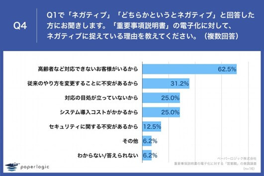 Q1で「ネガティブ」「どちらかというとネガティブ」と回答した方に、「Q4.「重要事項説明書」の電子化に対して、ネガティブに捉えている理由を教えてください。(複数回答)」(n=16)と質問したところ、「高齢者など対応できないお客様がいるから」が62.5%、「従来のやり方を変更することに不安があるから」が31.2%という回答となりました。