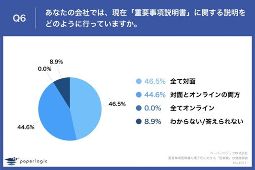 「Q6.あなたの会社では、現在「重要事項説明書」に関する説明をどのように行っていますか。」(n=101)と質問したところ、「全て対面」が46.5%、「対面とオンラインの両方」が44.6%という回答となりました。