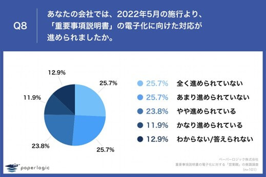 「Q8.あなたの会社では、2022年5月の施行より、「重要事項説明書」の電子化に向けた対応が進められましたか。」(n=101)と質問したところ、「全く進められていない」が25.7%、「あまり進められていない」が25.7%という回答となりました。