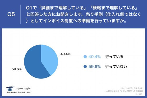 Q1で「詳細まで理解している」「概略まで理解している」と回答した方に、「Q5.売り手側(仕入れ側ではなく)としてインボイス制度への準備を行っていますか。」(n=52)と質問したところ、「行っている」が40.4%、「行っていない」が59.6%という回答となりました。
