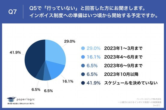 Q5で「行っていない」と回答した方に、「Q7.インボイス制度への準備はいつ頃から開始する予定ですか。」(n=31)と質問したところ、「2023年1~3月まで」が29.0%、「スケジュールを決めていない」が41.9%という回答となりました。