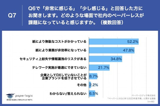 Q6で「非常に感じる」「少し感じる」と回答した方に、「Q7.どのような場面で社内のペーパーレスが課題になっていると感じますか。(複数回答)」(n=46)と質問したところ、「紙により無駄なコストがかかっている」が52.2%、「紙により業務が非効率になっている」が47.8%、「セキュリティ上紛失や情報漏洩のリスクがある」が34.8%という回答となりました。