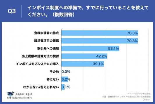 Q2で「準備は完了している」「完了していないが、準備を積極的に進めている」と回答した方に、「Q3.インボイス制度への準備で、すでに行っていることを教えてください。(複数回答)」(n=64)と質問したところ、「登録申請書の作成」が70.3%、「請求書項目の確認」が70.3%、「取引先への通知」が53.1%という回答となりました。