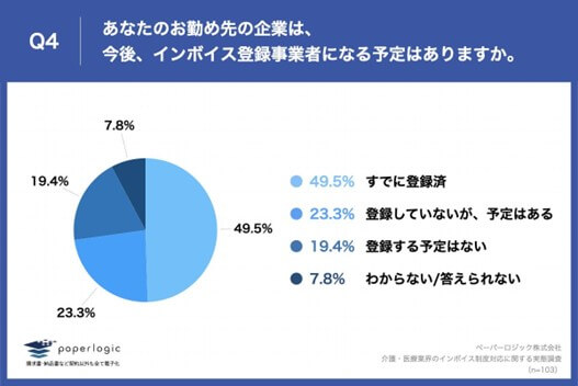 「Q4.あなたのお勤め先の企業は、今後、インボイス登録事業者になる予定はありますか。」(n=103)と質問したところ、「すでに登録済」が49.5%、「登録していないが、予定はある」が23.3%という回答となりました。