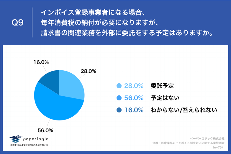 Q4で「すでに登録済」「登録していないが、予定はある」と回答した方に、「Q9.インボイス登録事業者になる場合、毎年消費税の納付が必要になりますが、請求書の関連業務を外部に委託をする予定はありますか。」(n=75)と質問したところ、「委託予定」が28.0%、「予定はない」が56.0%という回答となりました。